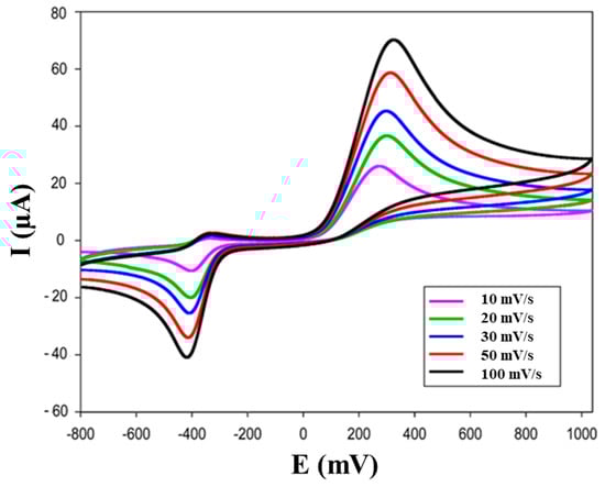 In Figure 7, it can also be seen that the oxidation peak shifts to a more positive value, while the reduction peak to more negative values proportional to the increasing scan rates with the increment of the current for this catecholamine.