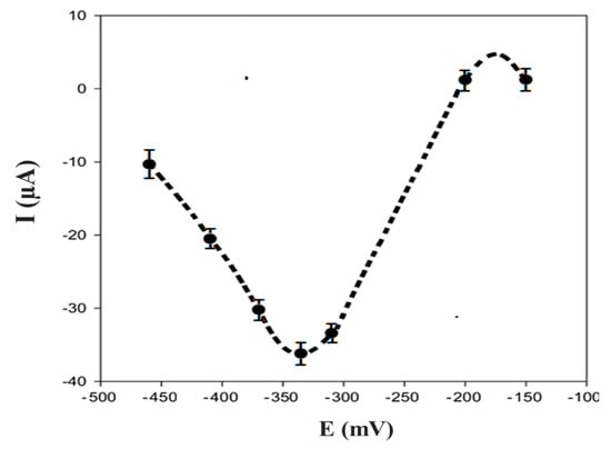The dependence of the biosensor’s response on the electrode potential is shown in Figure 9 using 100 μM EP in 50 mM PB + 10 mM KCl, pH 7.0. The maximum of the electrochemical signal was obtained at −0.32 V; this potential was applied to EP detection after the immobilization of a specific enzyme for this molecule.