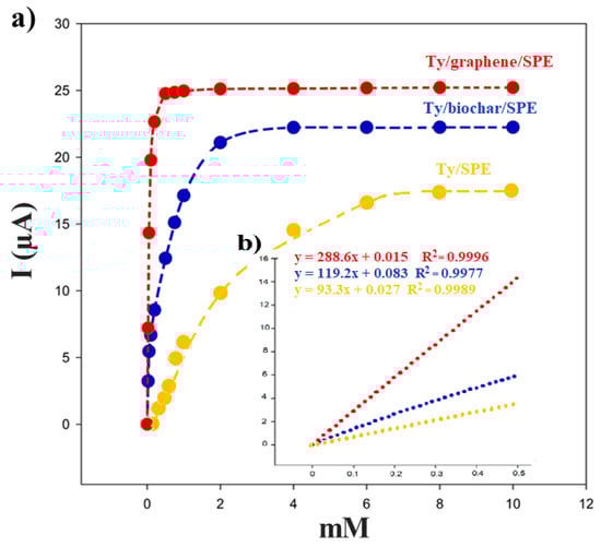 (a) Calibration curve between the cathodic current and the concentration of EP in 50 mM phosphate buffer + 10 mM KCl, pH 7.4: (blue) Ty/biochar/SPE, (red) Ty/GPH/SPE, and (yellow) Ty/bare SPE biosensor. (b) Linear range.