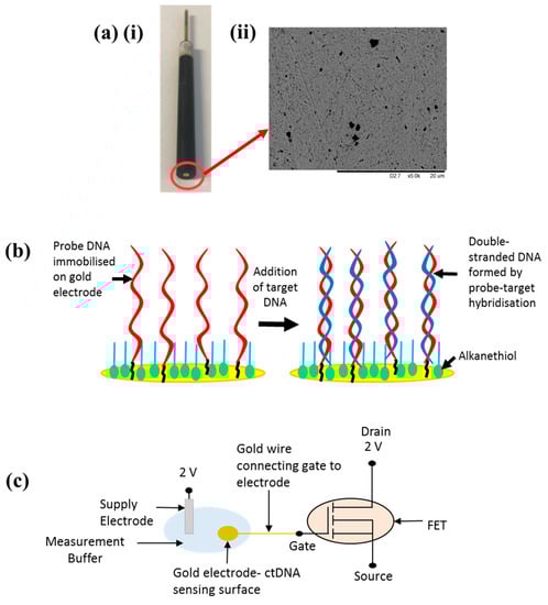 (a) (i) Polycrystalline gold electrode (PGE) acting as ‘sensing pad’ element of (field-effect transistor) (FET) sensor device. (ii) Scanning electron microscope (SEM) image of Au PGE electrode surface at × 5 k magnification. (b) Schematic of the sensing pad surface showing probe DNA with and without the hybridised complementary DNA target. (c) FET sensor equivalent circuit showing Au electrode sensing pad connected via an extended gate to the FET input side.