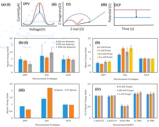 (a) Example electrochemical measurements (Differential pulse voltammetry (DPV) (i), Electrochemical impedance spectroscopy (EIS) (ii) and Open-circuit potentiometry (OCP) (iii)) depicting the effect of hybridisation with complementary target DNA compared to the initial ‘pre-target’ measurements. Pre-target data is shown in red and post-target data in blue. (b) Au electrode sensing pad optimisation experiments: (i) electrode diameter, (ii) DNA probe concentration, (iii) DNA probe with/without spacer and (iv) effect of measurement buffer on different concentrations of target DNA.