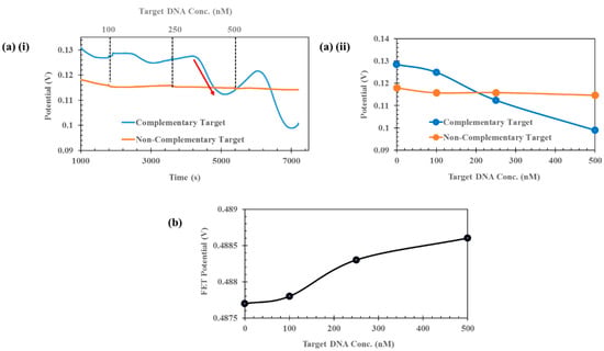 (a) (i) Continuous OCP measurement measuring change in potential as a function of increasing target DNA concentration over time. Graph shows the effect of complementary and noncomplementary target sequences on OCP. (a) (ii) Average OCP potential as a function of increasing target DNA concentration for complementary and noncomplementary DNA target sequences. (b) Average FET potential as a function of increasing target DNA concentration for complementary DNA target.