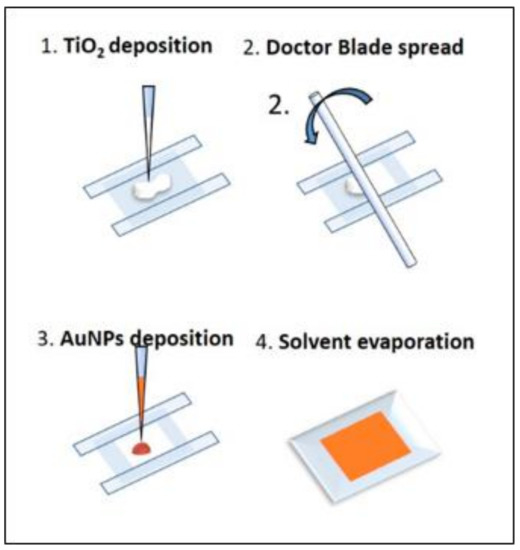 The fabrication procedure is schematically depicted in Figure 1. First, the PDMS matrix was prepared by mixing the Sylgard 184 elastomer with its curing agent (w/w = 10:1). Afterwards the polymeric mixture was degassed in vacuum for 40 min and poured on a clean glass petri-dish to obtain the desired thickness and cured in a microwave oven. The Design of Experiments (DoE) approach was used to determine the best conditions to obtain the desired features of the film. Three factors are considered in the optimization of the PDMS substrate preparation, i.e., the PDMS thickness (0.2 mm–2 mm), the curing time (3 min–15 min) and the microwave power (300 W–700 W). The experimental details with the corresponding results is reported in Supplementary Information. Final preparation procedure was defined for 1 mm PDMS film cured for 15 min at 700 W and cooled down to room temperature. TiO2 paste is prepared by mixing Aeroxide® P25 titanium dioxide powder in ethanol (EtOH). The suspensions were then homogenized for 10 min in ultra-sonic bath at 15 °C and at a power of 80 W to obtain stable and well de-agglomerated suspensions. The titanium dioxide paste was then used to prepare a thin porous film on the PDMS substrate by manual doctor blade deposition with the help of a glass stick used as a roller-pin [30]. A similar optimization approach was used to determine the best TiO2 deposition conditions. In this case the evaluated factors were TiO2 paste concentration (5–20%) and dropped volume (5 µL–15 µL). The operative conditions were kept constant in accordance with doctor blade published methodology [31]. Also in this case arbitrary appreciation scales are defined and performance indexes are attributed to different experimental results to evaluate the responses. Then a MRL model was calculated. The monitored responses were flexibility, i.e., absence of fractures on the dried films, adhesion, and water diffusion across the layer, responsible for AuNPs homogenous distribution. The list of experiments is reported in Table S3 with the associated responses, replicates are included to test reproducibility and strengthen the model. A mask defining an area of 0.5 × 0.5 cm2 is placed on PDMS film and 10 µL of TiO2 are dropped on the PDMS, the glass stick is rolled with a rapid movement on the surface applying a light pressure to spread the paste and remove the excess. The concentration and volume of the paste are optimized using DoE approach and MLR model. Optimized procedure consists in spreading 8 µL of 10% w/w TiO2 paste. AuNPs with nominal diameter of 120 nm are synthetized accordingly with procedure described in Section 2.2. After the synthesis they are concentrated and re-dispersed in EtOH to a final concentration factor of 1:20, by centrifugation (10 min, 3000 rpm) and removal of the clear supernatant. 10 µL of concentrated AuNPs\EtOH are dropped on the TiO2 square pad. The 120 nm AuNPs diffuse through the pores and micro-channels of the titanium dioxide layer and EtOH evaporates very rapidly provoking a uniform covering of the surface. After drying, the substrates are conserved in dark conditions.