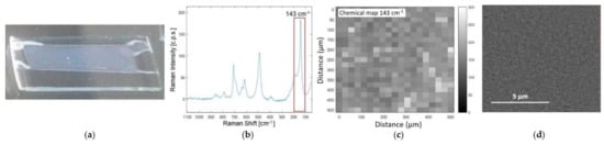 Characterization of the titanium dioxide porous layer deposited on PDMS after drying. (a) Visual appearance of the TiO2 film on PDMS; (b) mean spectrum of the entire map calculated by averaging the spectra corresponding to each pixel of the map; (c) Raman chemical map, in which the degree of grey is associated to the intensity of 143 cm–1 peak; (d) the SEM image of the TiO2 film on PDMS.