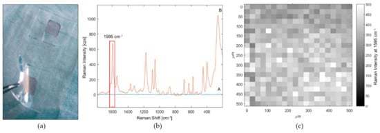 SERS substrate characterization test after incubation in 7-mercapto-4-methylcumarin (MMC) solution. (a) optical image of the prepared flexible SERS substrates. (b) mean spectra of SERS maps collected on PDMS/TiO2 substrate (A) without AuNPs (blue spectrum) and (B) with AuNPs (orange spectrum). (c) Raman map associated to the intensity of 1595 cm−1 peak of MMC.