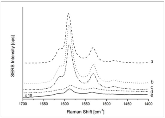 In order to test the sensitivity of response of the SERS substrate, this measurement was repeated at progressively lower concentration of MMC, providing a signal higher than the LOD (defined as 3 × S/N) down to 10−8 M, as shown in Figure 4. The SERS enhancement factor (EF) was also calculated to provide a quality parameter to compare with other literature SERS systems. The EF is based on the ratio of the SERS signal intensity over the intensity of normal Raman signals, both normalized by the number of molecules responsible of those signals. The calculated EF was to 3.4 × 105 ± 0.4 × 105 which is remarkable in comparison with recent results obtained for much more costly SERS substrates [35].