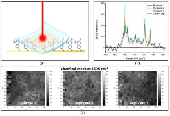 The optimized SERS substrate was tested in a real use configuration, i.e., stuck on a contaminated surface (the configuration is represented in the scheme in Figure 5a). The Raman measurement was performed in a transmission configuration with the excitation wavelength passing through the PDMS film and investigating the contaminated surface underneath the SERS substrate. The goal is to confirm the possibility to enhance Raman signals of molecules deposited on a surface after sticking the SERS substrate on it. For this scope a model surface is used, namely a Si chip coated with flat gold incubated in MMC 10−3 M for 4 h. Such incubation promotes the formation of a continuous monolayer of MMC molecules on the golden flat surface thanks to the interaction of the thiol group with Au atoms [36]. This contaminated flat model surface does not yield SERS effects because of its low roughness and the absence of LSPR (a control test spectrum collected on the MMC monolayer on the flat gold without the SERS substrate is showed in black in Figure 5b). The SERS substrate perfectly adheres to the flat model surface. The excitation laser is then focalized on the plane of contact between the flat model substrate (covered with one monolayer of MMC molecules) and the active side of SERS substrate, which exposes the AuNPs on the surface. The test was repeated three times to evaluate the reproducibility of the system.