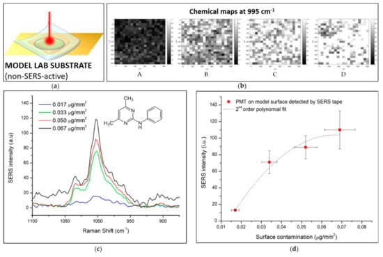 SERS detection of PMT spread on flat model surface by SERS. (a) graphical scheme of measurement configuration; (b) SERS chemical maps associated to the intensity of 996 cm−1 of model surface contaminated at (A) 0.017 µg/mm2, (B) 0.033 µg/mm2, (C) 0.050 µg/mm2, and (D) 0.067 µg/mm2; (c) average spectra of four repeated measurements for the four examined concentration levels; (d) SERS intensity versus contamination level plot with the associated error bars.