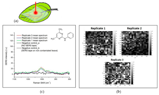 SERS detection of PMT traces on a Ficus Benjamina leaf spiked by drop casting a micro drop of fungicide on the leave page. (a) Graphic representation of the experiment configuration; (b) Mean spectra of three SERS maps and negative control spectra; (c) SERS maps correlated to 996 cm−1 peak intensity.