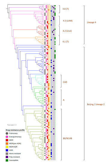 - Stucki, D.; Brites, D.; Jeljeli, L.; Coscolla, M.; Liu, Q.; Trauner, A.; Fenner, L.; Rutaihwa, L.; Borrell, S.; Luo, T.; et al. Mycobacterium tuberculosis lineage 4 comprises globally distributed and geographically restricted sublineages. Nat. Genet. 2016, 48, 1535–1543. [Google Scholar] [CrossRef] [PubMed]