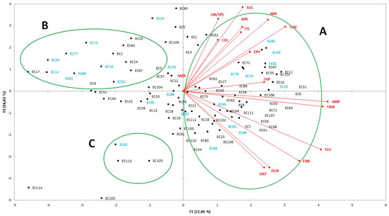 Biplot of principal component analysis (PCA) analysis showing the antibiotic resistance distribution among E. coli strains isolated from bovine (in blue) and poultry (in black).