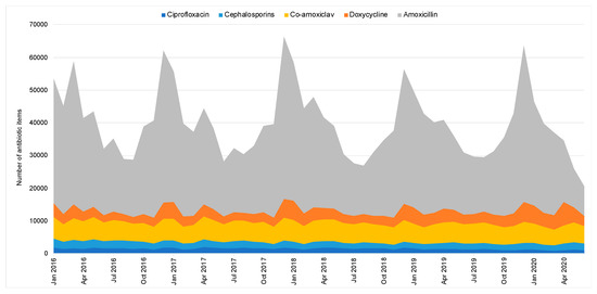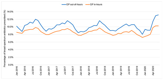 The prescription volume peaked each year in December for both IH and OOH GP (Figure 1). Prior to the COVID-19 pandemic (from January 2016 to February 2020), IH GP prescribing followed a downward trend; a decrease of 7329 items per month (95% CI: −12,478.14 to −2179.61, p < 0.05). For the same period, there was no statistically significant change in the number of items prescribed monthly in OOH (p = 0.42). Measured by the number of items, penicillins remained the most commonly prescribed antibiotic group (61.6%) by OOH GPs, followed by tetracyclines (11.2%) and macrolides (10.30%), which were the same as for IH GPs. Each year, the proportion of broad-spectrum antibiotics (cephalosporins, quinolones and co-amoxiclav) to the total prescription volume was the highest in August, both among IH and OOH GPs.