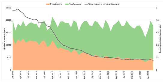 Between 2016 and 2020, there has been a consistent reduction in trimethoprim prescribing and the trimethoprim-to nitrofurantoin-ratio in OOH settings (Figure 4) from 1.9 in January 2016 to 0.3 in June 2020.