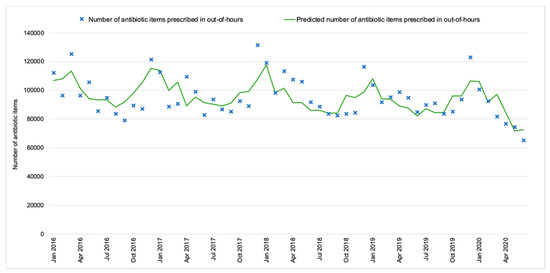 The trend of the OOH antibiotic prescribing volume between January 2016 and February 2020 remained stable. Since March 2020, there has been a decrease of 5088 items per month (95% CI: −6264.4 to −3912.0). The predicted monthly OOH antibiotic prescribing volume is presented in Figure 5 to illustrate the variation from the historical trend that would have been expected in the absence of the COVID-19 pandemic (Figure 5).