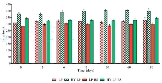Variation of size of liposomes (LP) and hyalurosomes (HY-LP) with and without biosurfactants (BS) during 180 days of storage at 4–8 °C (mean ± SD, n = 3).