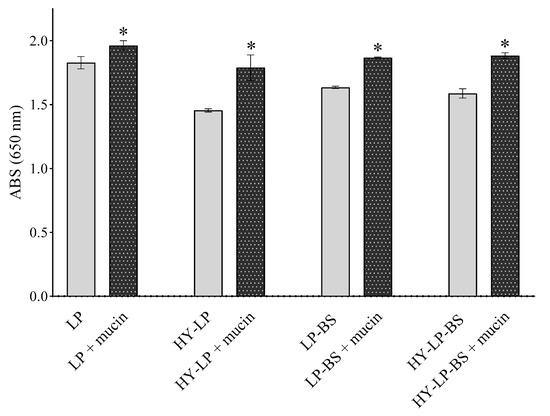 Absorbance at 650 nm measured for formulations incubated or not in the presence of mucin (mean ± SD, n = 3). The statistical significance with respect to formulation in absence of mucin was reported, *: p < 0.05.