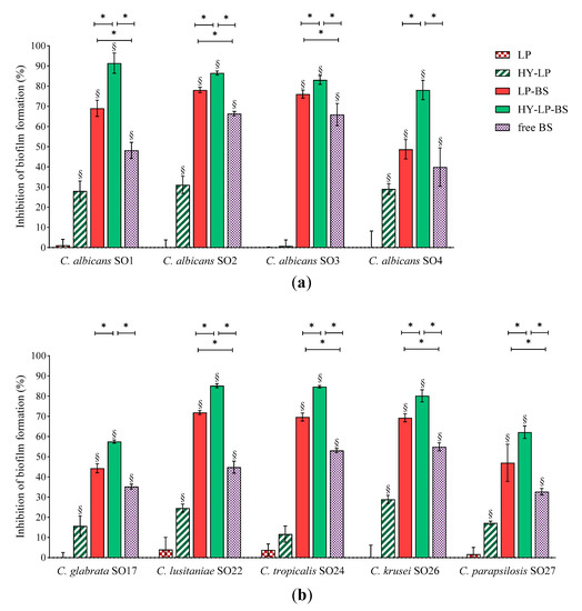 Anti-biofilm activity: inhibition of the development of (a) C. albicans and (b) non-albicans biofilms. Results are expressed as inhibition percentage (mean ± SD, n = 5). The statistical significance with respect to untreated control was reported, §: p < 0.01. Statistical differences between BS, LP-BS and HY-LP-BS were also calculated, *: p < 0.05.