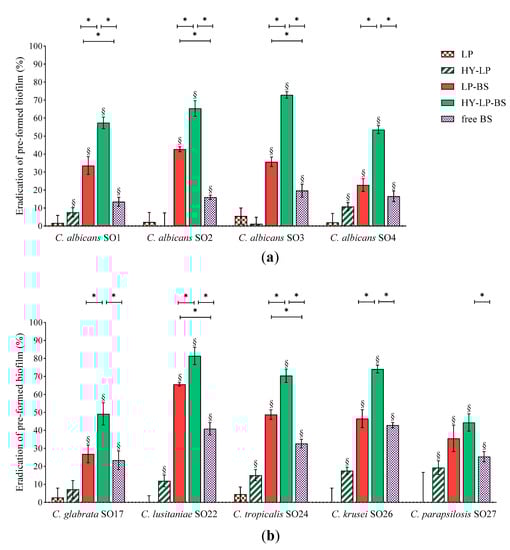 Anti-biofilm activity: dispersal of pre-formed (a) C. albicans and (b) non-albicans biofilms. Results are expressed as eradication percentage (mean ± SD, n = 5). The statistical significance with respect to untreated control was reported, §: p < 0.01. Statistical differences between BS, LP-BS and HY-LP-BS were also calculated, *: p < 0.05.