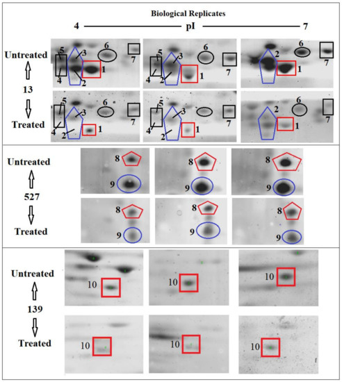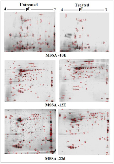 Scans from three independent experiments were compared to determine differences in protein quantities between treated and untreated isolates (Figure 3 and Figure 4; Supplementary Section S3A,B). A comparison between secreted protein quantification pre- and post- treatment with tigecycline was then made (Figure 5). Secreted proteins displayed marked differences both in number as well as in spot intensity after treatment with tigecycline. For example, 40 secreted proteins were decreased in MSSA (10E) after treatment with tigecycline. Similar trends were observed in all other isolates with 6, 41, 30, 26, and 18 secreted proteins decreased in MSSA (12E), MSSA (22d), MRSA (13), MRSA (139), and MRSA (527), respectively. In addition, the intensity of each protein expressed pre- and post- treatment was also assessed. Results generated found that there was only a decrease in the number and intensity of the protein spots after treatment with tigecycline. Here, 10 strongly expressed spots were then identified via LC-MS, like Putative uncharacterized protein, Alkaline shock protein 23, Alkyl hydroperoxide reductase subunit C, protein SA21194_0967, Superoxide dismutase, Arabinose efflux permease family protein, Alcohol dehydrogenase, propanol-preferring, Exotoxin 15, Putative Cytochrome c4, and Putative septation protein spoVG (Table 6, Figure 6).