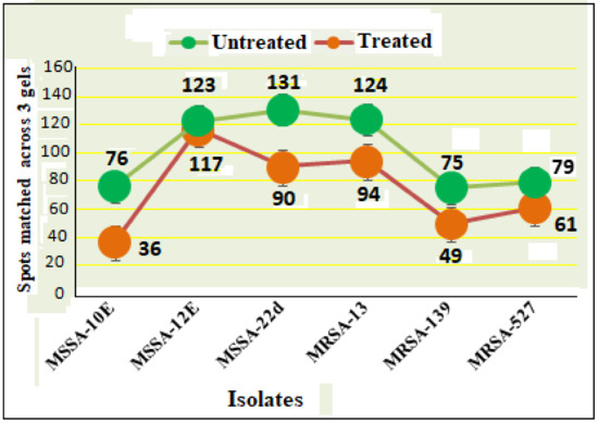 Secreted protein profiles of six clinical isolates of S. aureus with and without 0.5 tigecycline treatment. Numerical values on the actual graph represent number of extracellular proteins (spots) among the six isolates before (green circle) and after treatment (pink circle) with 0.5 tigecycline. Bars indicate scans from three independent experiments; data was normalized using the regression model recommended by PDQuest software (BioRad).