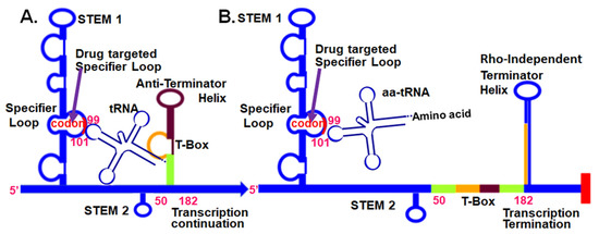 tRNA-dependent, T-Box, regulatory mechanism at the 5’UTR of aminoacyl-tRNA synthetase mRNAs in Gram-positive bacteria. (A) Unacylated tRNA bound to the T-box 5′UTR through the anticodon and the 3′-terminal CCA sequence. (B) The aminoacylated tRNA does not bind stably to the 5′UTR. Small-molecule intervention (arrow) that inhibits Specifier Loop codon interaction with an unacylated (or acylated) tRNA’s anticodon will terminate transcription [41].