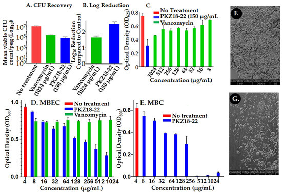Assessment of PKZ18-22 effect on Staphylococcus biofilms. (A) S. aureus biofilm colony forming units (CFU/log10) after 24 h of a single dose antibiotic and the PKZ18 analog PKZ18-22. (B) Log reduction after a single dose 24 h challenge. PKZ18-22 treatment exhibited 2.5 log reduction, which corresponds to >99% bacterial cell reduction; significantly greater reduction compared to vancomycin. (C) Growth of S. aureus after 24 h exposure to PKZ18-22 vs. dosages of vancomycin in the minimum biofilm eradication (MBEC) biofilm model. Optical density measured as a surrogate for turbidity/bacterial growth demonstrated significant growth reduction with PKZ18-22 treatment compared to all vancomycin concentrations and negative controls. (D) The MBEC efficacy of a range of concentrations of PKZ18-22 compared with vancomycin using the same parameters as C. (inoculum, media concentration, etc.) but using new lot of PKZ18-22 and vancomycin stocks. No growth with vancomycin. (E) The minimum bactericidal concentration (MBC) efficacy of a range of concentrations of PKZ18-22. Scanning electron micrographs of peg surfaces: (F) no treatment and (G) treatment with PKZ18-22.