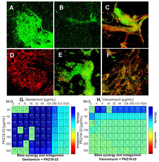 PKZ18-22–antibiotic synergy on S. aureus biofilm growth. (A) Biofilm grown for 24 h with no treatment. (B) Biofilm growth after 24 h exposure to 25 µg/mL PKZ18-22. (C) Growth after 24 h exposure to 4 µg/mL gentamicin. (D) Growth after 24 h exposure to 64 µg/mL gentamicin + 25 µg/mL PKZ18-22. (E) Growth after 24 h exposure to 4 µg/mL vancomycin. (F) Growth of S. aureus after 24 h exposure to 4 µg/mL vancomycin + 25 µg/mL PKZ18-22. (G) Synergy score matrix for drug combination of PKZ18-22 and gentamicin using a drug interaction Bliss reference model. The highest drug synergy was observed with PKZ18-22 of 25 µg/mL and gentamicin concentrations of 16–64 µg/mL (p < 0.001). (H) Synergy score matrix for drug combination of PKZ18-22 and vancomycin. By definition all synergy scores above zero are synergistic. Synergy scores of PKZ18-22 and vancomycin exhibited significantly lower effects compared to PKZ18-22 and gentamicin. The highest synergy score was observed at 4 µg/mL vancomycin + 25 µg/mL PKZ18-22. Asterisk’s indicate level of confidence in results, probability of obtaining test results: * indicates p < 0.05; ** indicates p < 0.001; *** indicates p < 0.0001.