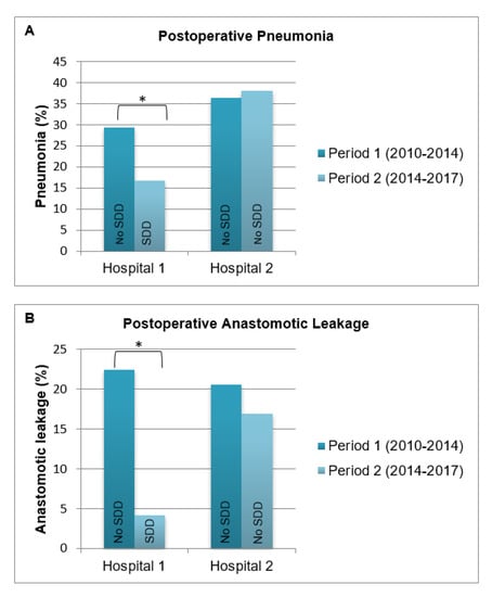 The post-hoc sensitivity analysis is shown in Figure 1. When comparing the incidence of postoperative pneumonia (A) and anastomotic leakage (B) in period 1 (2010–February 2014) with period 2 (March 2014–2017) per hospital, significant decreases in pneumonia and anastomotic leakage were observed only in the hospital where SDD was implemented (hospital 1).