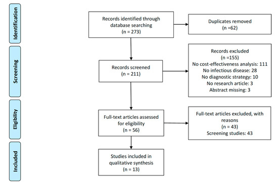 The Preferred Reporting Items for Systematic Reviews and Meta-Analyses (PRISMA) guidelines were followed in this study [23]. Articles included in this review compare both the costs and the clinical effectiveness outcomes of at least two different diagnostic strategies for H. pylori infection. We assess the efficiency a strategy that reduces the uncertainty of the physician when a patient with symptoms common to several diseases must be diagnosed in clinical practice. Accordingly, screening and genotype studies were excluded. The main difference between diagnostics and screening is the population: in the former it concerns patients presenting with symptoms and in the latter it concerns the general population which is to be healthy [24,25]. Protocols and review articles were also excluded.