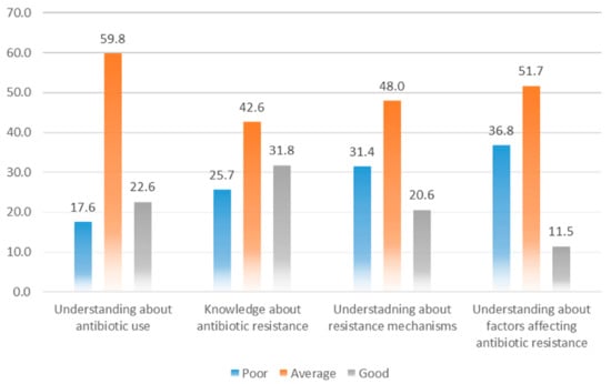 The understanding of most of the respondents (n = 142, 48%) about the resistance mechanism was average; however, 61 (20.6%) had a good understanding (Figure 1). Many students agreed that beta-lactamases cause the breakdown of beta-lactam antibiotics (n = 213, 72.0%), and bacteria could use drug efflux mechanisms to produce ABR (n = 164, 55.4%) as shown in Table 4. However, a minimal number of respondents answered correctly about statements such as “There is no resistance to penicillin for Streptococcus pyogenes” (n = 90, 30.4%). The respondents with age 19–21 years were more aware of the ABR mechanisms than 22–24 years (Median = 2.0, IQR = 0.50, Median = 1.5, IQR = 1.00; p = 0.002) (Table 7).