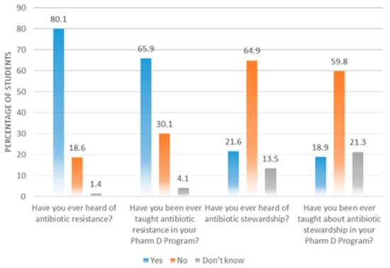 Most of our study respondents were familiar with ABR as this was taught to them during their PharmD; however, their awareness towards antibiotic stewardship programs was limited. Our previous study conducted with clinicians also showed limited awareness of stewardship programs []. Although ABR is now a part of the curriculum in many pharmacy schools, information about stewardship programs is still missing. Many countries, such as South Africa and the United States, have successfully included antibiotic stewardship programs in their pharmacy curricula [,].