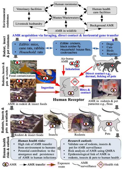 Source–pathway–receptor depiction of the occurrence, circulation, and human health risks of antimicrobial resistance (AMR) in rodents, insects, and pets. The arrows depict the complex exchange of AMR among the various reservoirs or resistomes.