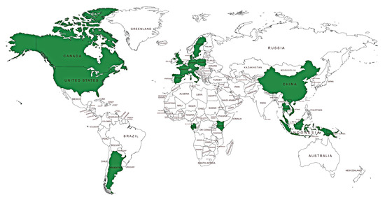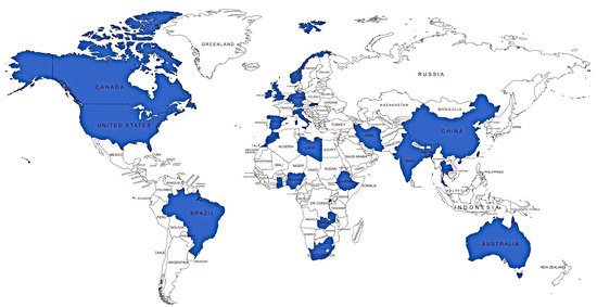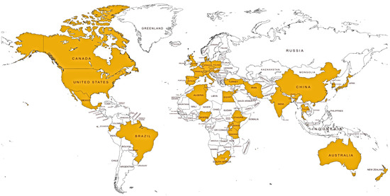 Countries (shaded) that reported AMR in pets in the period 2010–2020. The search was based on PubMed Central and Google Scholar databases.