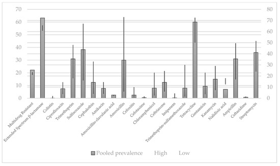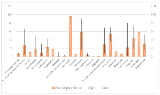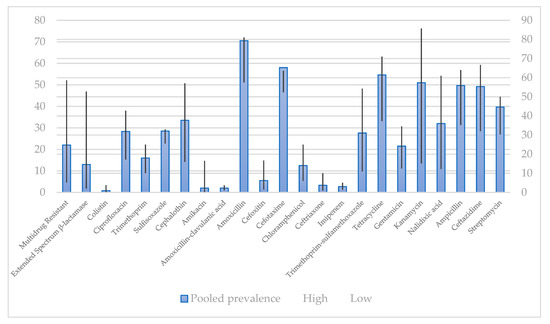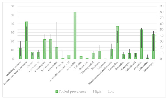 - Pormohammad, A.; Nasiri, M.J.; Azimi, T. Prevalence of Antibiotic Resistance in Escherichia Coli Strains Simultaneously Isolated from Humans, Animals, Food, and the Environment: A Systematic Review and Meta-Analysis. Infect. Drug Resist. 2019, 12, 1181–1197. [Google Scholar] [CrossRef]