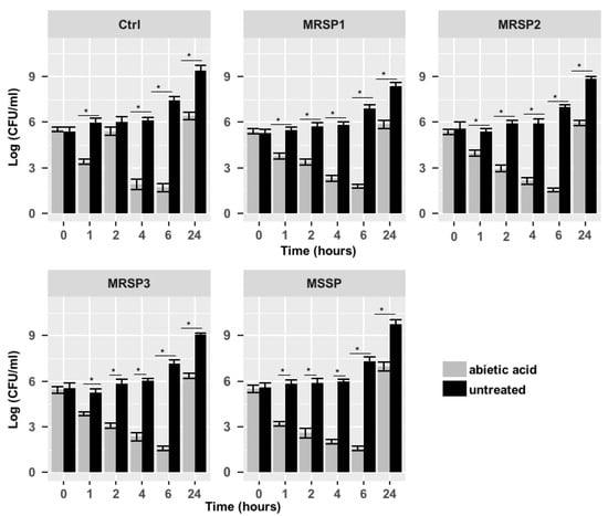 Figure 1. Time-kill assay of abietic acid against Ctrl, MRSP1-3 and MSSP strains. Each experiment is the result of three independent experiments performed in triplicate. Ctrl: human antibiotics susceptible S. pseudintermedius strain; MSSP: veterinary methicillin-susceptible strain; MRSP1: veterinary methicillin-resistant S. pseudintermedius strain; MRSP2 and 3: human methicillin-resistant S. pseudintermedius strains. * represents p  <  0.05.