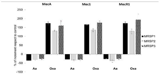 Figure 2. Relative expression of genes of mec operon in MRSP strains treated with subinhibitory concentration of abietic acid (16 mg/mL for MRSP1 and MRSP3, and 32 mg/mL for MRSP2) and 1 mg/mL oxacillin. Values represent the mean ± SD for three independent experiments. MRSP1: veterinary methicillin-resistant S. pseudintermedius strain; MRSP2 and 3: human methicillin-resistant S. pseudintermedius strains. Aa: abietic acid; Oxa: oxacillin.