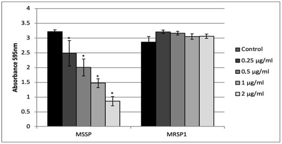 Crystal violet assay was used to test the ability of abietic acid to inhibit biofilm formation of treated MSSP and MRSP1. We tested sub-MIC concentrations ranging from 0.5 μg/mL to 2 μg/mL (1/16 MIC and 1/4 MIC for MSSP; and 1/64 MIC and 1/16 MIC for MRSP1, respectively) at which no effect on the planktonic growth was evident. Abietic acid at 2 μg/mL strongly reduced MSSP biofilm biomass, by causing 73% inhibition (Figure 3). The inhibition of MSSP biofilm formation was dose dependent and statistically different from the control for each concentration tested. On the other hand, abietic acid was not able to inhibit MRSP1 biofilm formation at any of the tested concentrations.