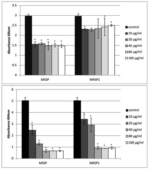 Figure 4. Effect of abietic acid on one-day-old biofilms of S. pseudintermedius. Upper panel: biofilm biomass obtained by crystal violet staining; bottom panel: biofilm vitality obtained by XTT assay. Bars represent the average values ± SD from three independent experiments. * represents p < 0.05.