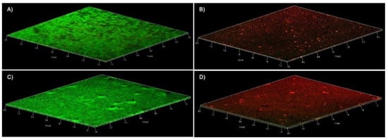 Figure 5. Confocal laser scanner microscopy micrographs of MSSP and MRSP1 biofilms. The panels contain three-dimensional images, green and red fluorescence is associated with live and dead cells, respectively. (A) MSSP untreated biofilm (B) MSSP biofilm treated with abietic acid at 20 µg/mL (C) MRSP1 untreated biofilm (D) MRSP1 biofilm treated with abietic acid at 40 µg/mL.
