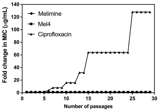 Increase in MIC values of ciprofloxacin, melimine or Mel4 against S. aureus ATCC 25923 after exposing bacteria at their sub-MIC for 30 consecutive days. The MIC values of melimine and Mel4 did not change over time and overlap at the bottom of the figure.