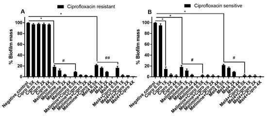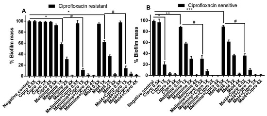 The biofilms produced by the ciprofloxacin-sensitive cells of ATCC 25923 were inhibited by ≥86% by ciprofloxacin at ≥1X MIC (p < 0.001; Figure 3B). Melimine or Mel4 were active at 0.5X MICs and produced 82% and 78% biofilms inhibition compared to negative control, respectively (p < 0.001). The combinations of melimine or Mel4 with ciprofloxacin at 0.5X MIC produced reductions that were significantly higher (97%) than those used alone at 0.5X (p < 0.001). The combinations of either AMP with ciprofloxacin inhibited the same amount of biofilm at 0.5X MICs (p > 0.999; Figure 3B).