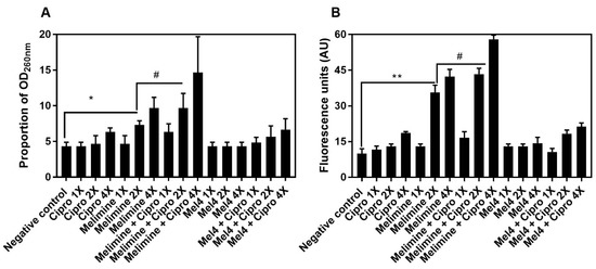 The release of nucleic acids (260 nm absorbing material) after incubation for 4 h with the antimicrobials from pre-formed biofilms of S. aureus ATCC 25923 is shown in Figure 8A. Melimine released a significantly higher amount of DNA/RNA at 2X MIC (7 ± 1 times; p = 0.043) and 4X MIC (13 ± 1 times; p < 0.001) compared to control. Ciprofloxacin did not cause significant DNA/RNA leakage from the pre-formed biofilms at any concentration tested (p > 0.999; Figure 8A). The combination of melimine and ciprofloxacin released 10 ± 2 times (p = 0.047) more DNA/RNA compared to negative control at 2X MIC. Melimine and ciprofloxacin in combination released significantly higher (p = 0.022; Figure 8A) amounts of DNA/RNA than melimine alone at 2X MIC. The combination of Mel4 and ciprofloxacin did not release significant amounts of DNA/RNA at any concentration tested (p ≥ 0.480). Melimine either alone or in combination with ciprofloxacin produced higher fluorescence at 2X and 4X MICs than other concentrations (p ≤ 0.034; Figure 8B). Mel4 either alone or in combination with ciprofloxacin did not produce significant fluorescence at any concentration tested (p > 0.999; Figure 8B).