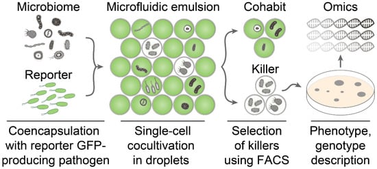 Ultrahigh-throughput screening of antimicrobial activity is based on a single-cell encapsulation of microbiome representatives together with fluorescent protein-producing reporter bacteria followed by isolation of droplets with inhibited growth of reporter bacteria using FACS (Figure 1).