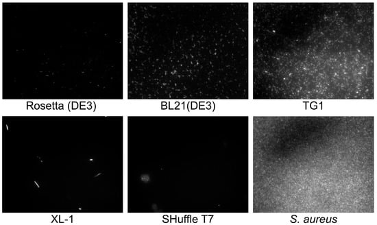 Genetic constructs and strains. All genetic constructs were based on high-copy vector plasmid PURExpress Control DHFR Plasmid (NEB, Ipswich, MA, USA). Multiple cloning sites including XbaI, XhoI, and XmaI restriction sites flanked by NheI/HindIII sites were inserted to replace the T7 promoter-DHFR-T7 terminator region, resulting in pIvi-MCS vector. Promoter sequences were obtained by PCR assembly and cloned into pIvi-MCS digested with XbaI and XhoI. The pglpT is a strong constitutive promoter []. OXB20 is the strongest RecA promoter derivative with an ablated repressor binding site to enable constitutive expression (PSF-OXB20, OGS50, Sigma). The pJ23119 is the strongest promoter in a family of constitutive promoters isolated from a combinational library (PMID: 23560087). The pEm7 is a constitutive synthetic derivative of a T7 promoter (part Doulix biofundry, part ENW51Y). TagGFP2 and sfGFP genes were PCR amplified from pTagGFP2-N (Evrogen, Moscow, Russia) and pYTK047 plasmids, respectively, and cloned with XhoI/XmaI restriction sites. The pYTK047 was a gift from John Dueber (Addgene plasmid # 65154; http://n2t.net/addgene:65154; RRID:Addgene_65154, accessed on: 1 May 2018). The terminator region containing rrnB1 and T7 terminators was PCR amplified from pYTK047 and cloned with XmaI/HindIII restriction sites. The following E. coli strains were used: Rosetta (DE3) (Novagen, Madison, WI, USA), BL21(DE3) (Invitrogen, Waltham, MA, USA), TG1 (Lucigen, Middleton, WI, USA), XL-1 (Agilent, Santa Clara, CA, USA), and SHuffle T7 (NEB, Ipswich, MA, USA). Control GFP-producing reporter S. aureus cells were described previously [,,].
