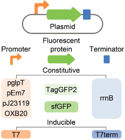 A panel of plasmids that were used for the optimization of E. coli-based live biosensors. All genetic constructs were constructed on the same high-copy number template vector. Two different fluorescent proteins, i.e., TagGFP2 and sfGFP, were used. Constitutive (pglpT, pEm7, pj23119, and OXB20) and inducible (T7) promoters were compared in terms of efficiency, homogeneity of cell fluorescence, and stability.