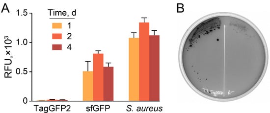 Moreover, TagGFP2-producing plasmids based on T7 promoter tend to be lost under induction, resulting in a highly heterogeneous population with varying fluorescence of colonies (Figure 4B). Hence, sfGFP was used as a reporter fluorescent protein.