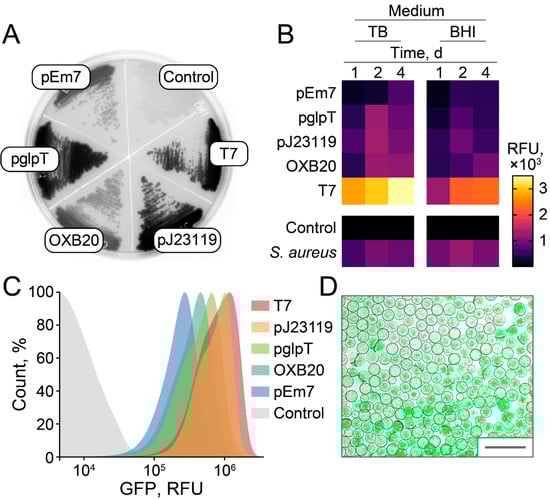 Efficacy of different promoters for constitutive and homogeneous production of GFP in E. coli. (A) A representative BHI-agar plate with E. coli, producing sfGFP under control of various promoters. Constitutive E. coli promoters, i.e., pEm7, pglpT, pJ23119, and OXB20, were compared with leaking T7. E. coli cells transformed with empty vector without sfGFP insert were used as a negative control. (B) Fluorescence of bacterial cultures obtained after 1, 2, and 4 days of cultivation in TB or BHI medium. Relative fluorescence units (RFU) are presented as a heatmap indicating bulk fluorescence of cell cultures. GFP-producing reporter S. aureus cells were used as a positive control. Data represent the mean of three biological replicates. (C) Flow cytometry of bacterial cultures producing sfGFP obtained after 2 days of cultivation in BHI medium. (D) Live biosensors producing sfGFP under control of pJ23119 promoter after 1 day of cultivation in droplets of microfluidic double water-in-oil-in-water emulsion. Scale bar: 100 μm.