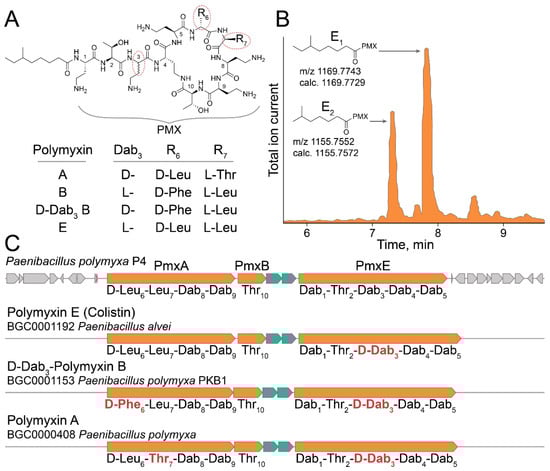 Whole genome sequencing of P. polymyxa P4 enabled identifying the biosynthetic gene cluster (BGC) of polymyxin E (Figure 6C). P. polymyxa P4 polymyxin E BGC has the same architecture as all polymyxin BGCs mediating the production of polymyxin A [], D-Dab3-polymyxin B [], and polymyxin E [] identified previously. Polymyxin E BGC encodes d-Leu instead of d-Phe in module 6 of D-Dab3-polymyxin B, Leu instead of Thr in module 7 of polymyxin A, and Dab instead of D-Dab in module 3 of all known polymyxins. While modules 6 and 7 encode amino acid residues varying between polymyxins, module 3 does not have an epimerization domain. Hence, we predicted that the identified polymyxin E produced by P. polymyxa P4 has natural L-stereochemistry. It was recently shown that the epimerization domain of module 3 may be functional, at least in the case of P. polymyxa PKB1 strain producing D-Dab3-polymyxin B []. Therefore, the stereochemistry of Dab3 is questionable for some polymyxins. However, it is unambiguous for the identified polymyxin E produced by P. polymyxa P4.