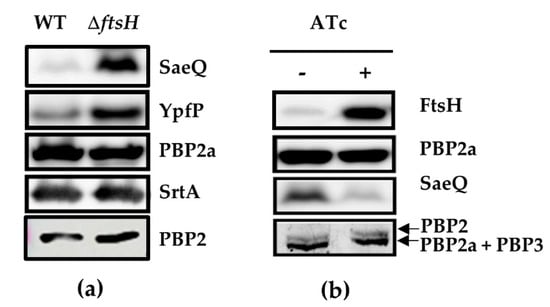 PBP2a and PBP2 are critical for MRSA β-lactam resistance [,,,]. Similar to FtsH, both PBPs are located in the membrane, raising the possibility that FtsH directly degrades those PBPs, resulting in lower β-lactam resistance. To test this possibility, we measured the expression levels of the PBP2a and PBP2 in WT, ΔftsH, and the FtsH overexpression strain ΔftsH (pYJ-ftsH-His6). PBP2a was detected by Western blotting, and PBP2 was visualized by the Bocillin-FL assay, where the fluorescent penicillin is used as a probe to detect PBPs []. The FtsH-overexpression strain was grown in the presence or absence of the inducer ATc. As expected, the ftsH-deletion increased the cellular levels of the two FtsH substrate proteins, SaeQ and YpfP (Figure 1a). However, similar to the non-substrate protein SrtA, no significant change was observed in the expression level of PBP2a or PBP2 (Figure 1a), indicating that FtsH does not degrade PBP2a and PBP2. When FtsH was overexpressed from pYJ-ftsH-His6, the expression level of the FtsH substrate protein SaeQ was decreased; however, no significant changes were observed in the cellular levels of PBP2a or PBP2. Based on these results, we concluded that the β-lactam-sensitizing effect of FtsH is not due to the direct degradation of PBP2a or PBP2 by FtsH.