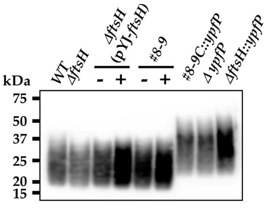 In an agreement with the report by the Tomasz group [], when we deleted the ftsH gene in S. aureus USA300, the oxacillin MIC of the strain increased eightfold from 8 µg/mL to 64 µg/mL. The MIC increase was abolished by the further deletion of mecA (the gene encoding PBP2a) (ΔftsH vs. ΔftsHΔmecA in Table 1), indicating that PBP2a is essential for the increased oxacillin resistance. Since the deletion of ftsH increased the oxacillin MIC, we suspected that the overexpression of FtsH would decrease the MIC. Indeed, when FtsH was overexpressed from pYJ-ftsH-His6, a multi-copy plasmid with anhydrotetracycline (ATc)-inducible promoter, the oxacillin MIC of USA300 decreased 16-fold from 8 µg/mL to 0.5 µg/mL (Table 1). Neither the plasmid vector nor the inducer ATc affected the oxacillin MIC (see WT(pYJ335) + ATc in Table 1). Moreover, when FtsH was overexpressed in the hospital-acquired MRSA strain COL and the community-acquired strain MW2 [,], their oxacillin MICs also decreased (Table 1). These results indicate that FtsH sensitizes MRSA to β-lactams, and the β-lactam-sensitizing effect of FtsH is likely conserved in S. aureus strains.